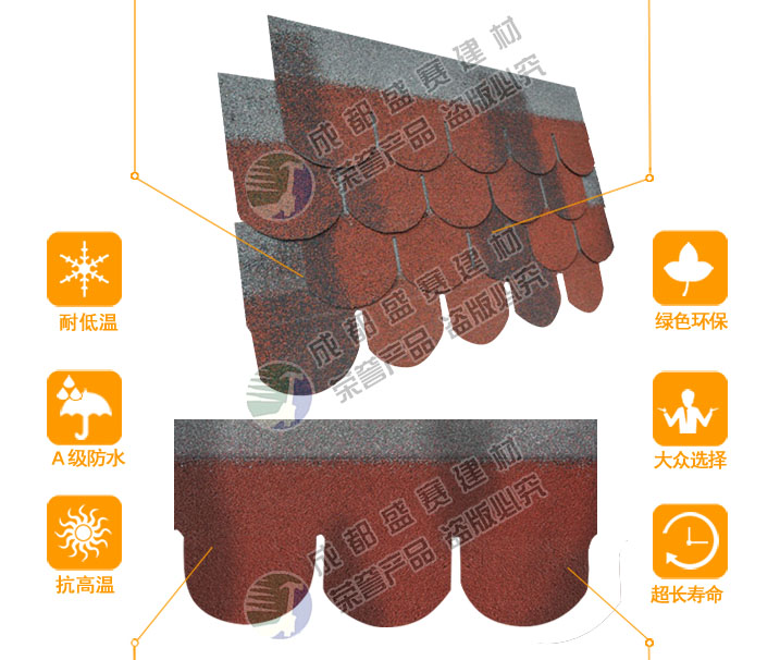 产品名称:鱼鳞型 产品规格:单层 产品颜色:迷彩亚洲红 长度(mm):1000mm±3 mm 包装:每包21片