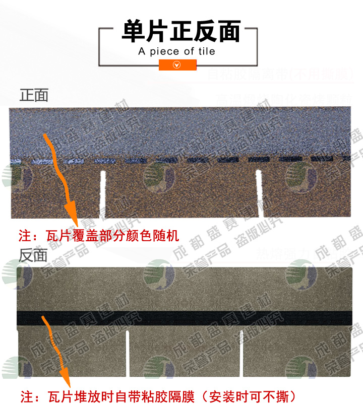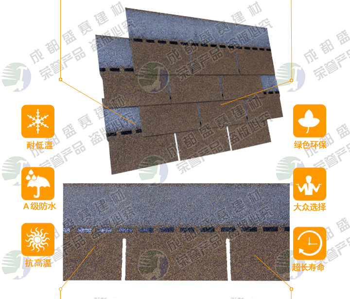 本款产品颜色丰富,立体感强,一般适用于广泛应用于高档别墅、高档小区、政府安置工程,学校工程等工程,产品可自由裁剪,能成功覆盖于不同形状和不同基层的屋顶。适用屋面坡度从15°到90°不同建筑。