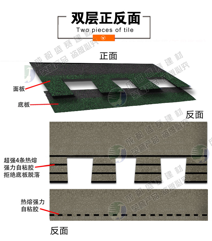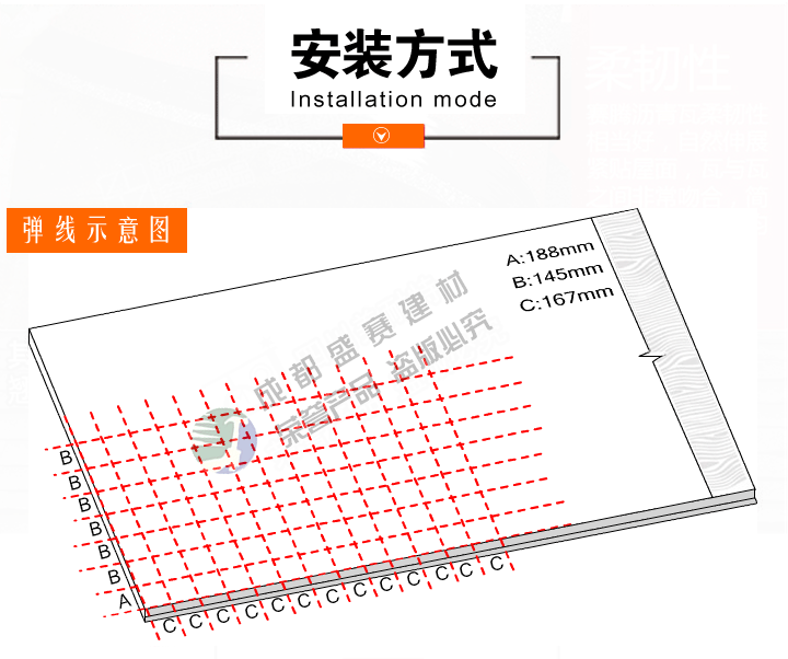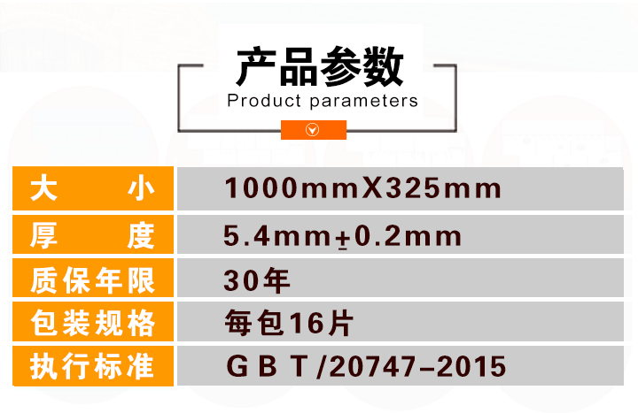 包装:每包16片宽度(mm):340mm 厚度(mm): 5.2mm 重量(kg/m2):每包28KG±1KG 每平方米所需瓦片(片):6.8片