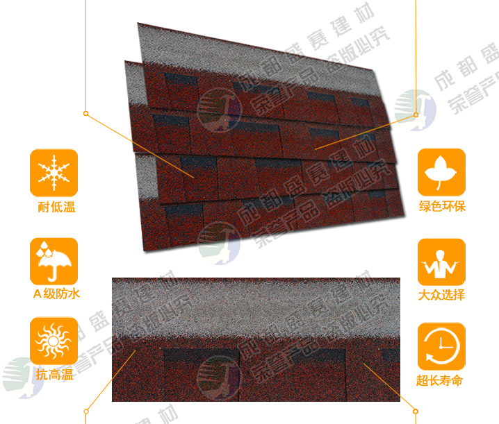 本款产品颜色丰富,一般适用于广泛应用于高档别墅、高档小区等工程,产品可自由裁剪,能成功覆盖于不同形状和不 同基层的屋顶。适用屋面坡度从15°到90°不同建筑。