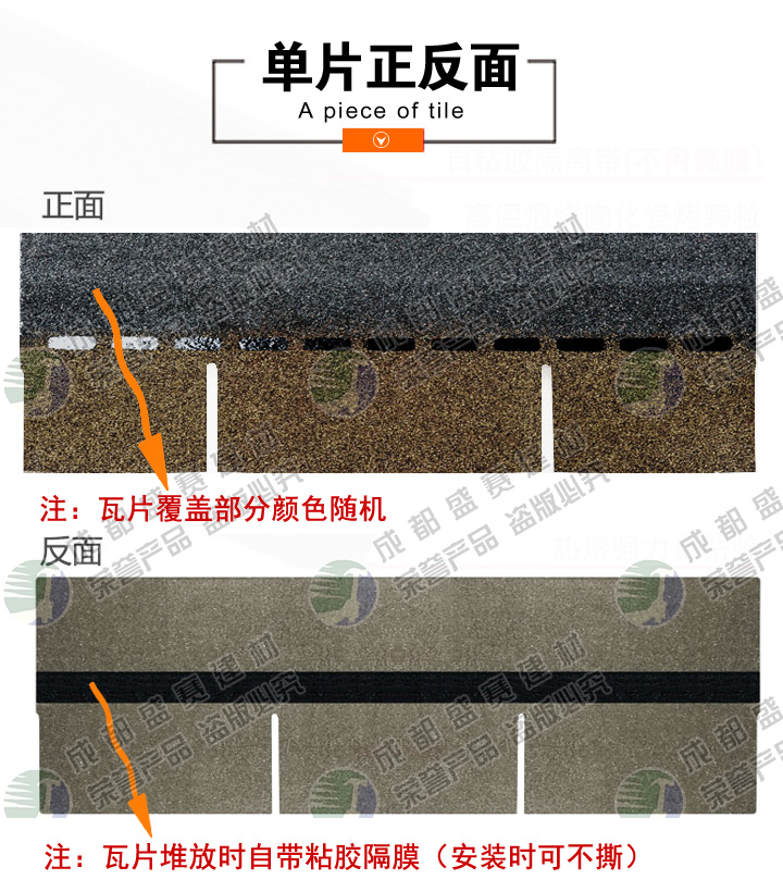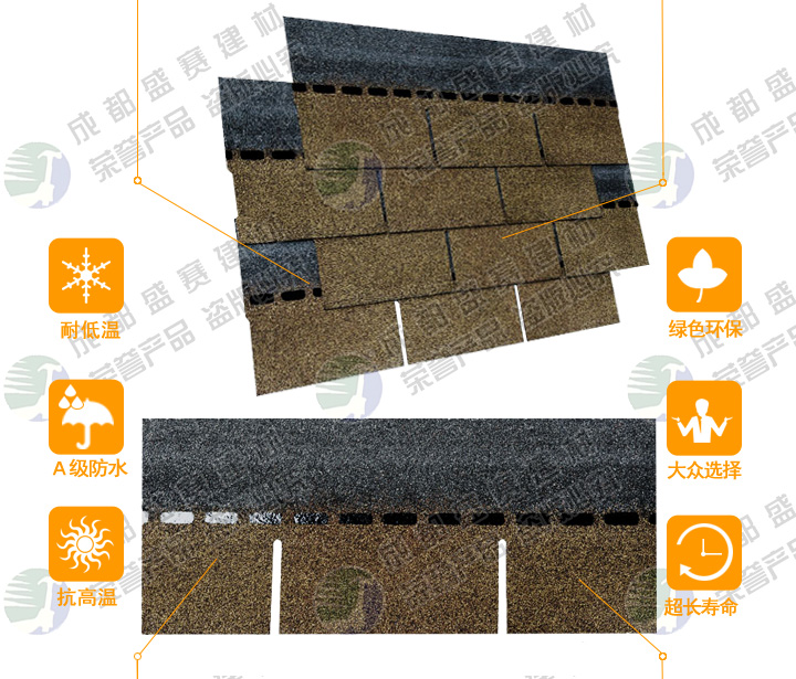 本款产品颜色丰富,立体感强,一般适用于广泛应用于高档别墅、高档小区、政府安置工程,学校工程等工程,产品可自由裁剪,能成功覆盖于不同形状和不同基层的屋顶。适用屋面坡度从15°到90°不同建筑。